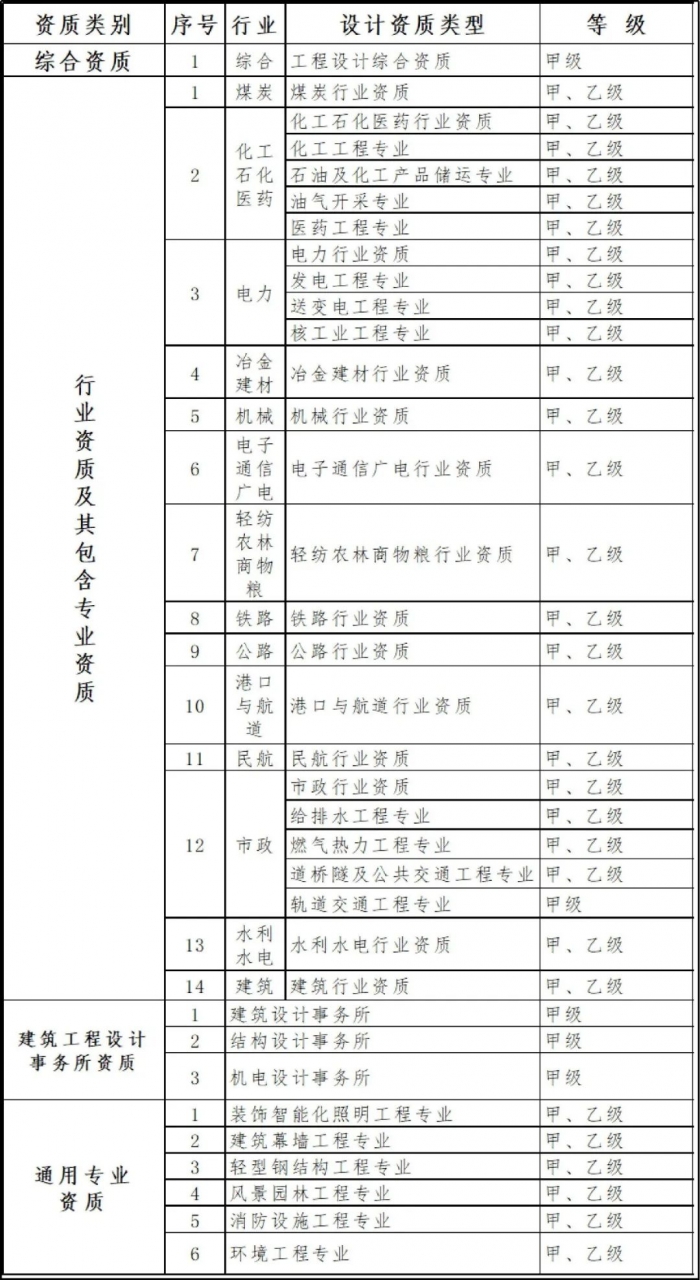 保留綜合資質(zhì)。對(duì)部分行業(yè)資質(zhì)進(jìn)行整合,其中,冶金行業(yè)與建材行業(yè)合并為冶金建材行業(yè)資質(zhì),輕紡行業(yè)、農(nóng)林行業(yè)、商物糧行業(yè)合并為輕紡農(nóng)林商物糧行業(yè),電子行業(yè)、通信行業(yè)、廣電行業(yè)合并為電子通信廣電行業(yè),石油天然氣行業(yè)并入化工石化醫(yī)藥行業(yè),軍工行業(yè)并入機(jī)械行業(yè),核工業(yè)行業(yè)并入電力行業(yè),資質(zhì)等級(jí)壓減為甲、乙兩級(jí),原丙級(jí)資質(zhì)并入相應(yīng)行業(yè)乙級(jí)資質(zhì)。取消海洋行業(yè)及專業(yè)資質(zhì),相關(guān)企業(yè)可以換發(fā)相近行業(yè)資質(zhì)。整合原化工石化醫(yī)藥、石油天然氣、電力、市政行業(yè)中的專業(yè)資質(zhì),資質(zhì)等級(jí)壓減為甲、乙兩級(jí),原丙級(jí)資質(zhì)并入相應(yīng)專業(yè)乙級(jí)資質(zhì);取消其他行業(yè)的專業(yè)資質(zhì),并入相應(yīng)行業(yè)資質(zhì),原甲、乙級(jí)專業(yè)資質(zhì)并入相應(yīng)等級(jí)的行業(yè)資質(zhì),原丙級(jí)專業(yè)資質(zhì)并入乙級(jí)行業(yè)資質(zhì)。將專項(xiàng)資質(zhì)調(diào)整為通用專業(yè)資質(zhì),取消環(huán)境工程專項(xiàng)資質(zhì)的5個(gè)專項(xiàng)類別,整合為環(huán)境工程專業(yè)資質(zhì),資質(zhì)等級(jí)壓減為甲、乙兩級(jí),原丙級(jí)資質(zhì)并入相應(yīng)專業(yè)乙級(jí)資質(zhì)。保留3類事務(wù)所資質(zhì)。新3.jpg