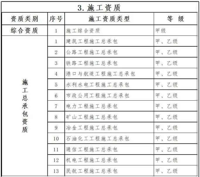 將施工總承包特級(jí)資質(zhì)調(diào)整為施工綜合資質(zhì),取得原10類施工總承包特級(jí)資質(zhì)中的任一類,即可換發(fā)綜合資質(zhì)。取得綜合資質(zhì)的企業(yè),可承擔(dān)各類別、各等級(jí)施工總承包業(yè)務(wù),不再申請(qǐng)或持有其他施工資質(zhì)。