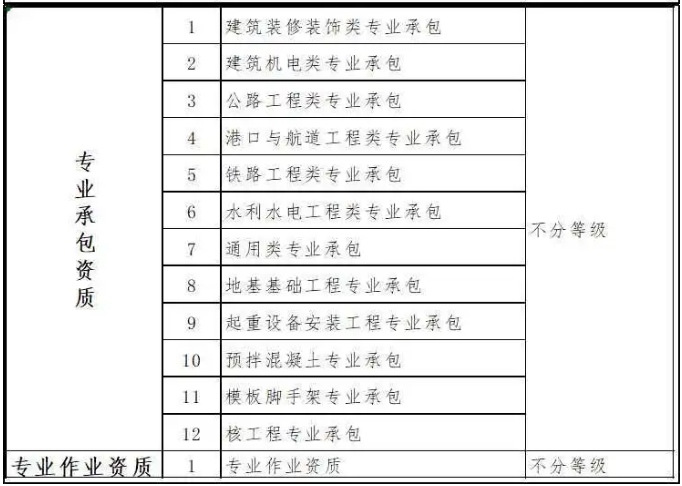 保留地基基礎(chǔ)工程、起重設(shè)備安裝工程、核工程等專業(yè)承包資質(zhì);將原專業(yè)承包資質(zhì)整合為建筑裝修裝飾類、建筑機(jī)電類、公路工程類、港口與航道工程類、鐵路工程類、水利水電工程類、通用類專業(yè)承包資質(zhì);專業(yè)承包資質(zhì)不分等級(jí)。