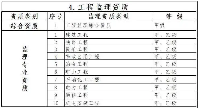 保留綜合資質(zhì)。取消水利水電工程、公路工程、港口與航道工程等專業(yè)資質(zhì),其資質(zhì)要求執(zhí)行有關(guān)行業(yè)主管部門規(guī)定。取消農(nóng)林工程監(jiān)理資質(zhì),建設(shè)單位委托農(nóng)林工程監(jiān)理業(yè)務(wù)時(shí),不再作資質(zhì)要求。上述4個(gè)監(jiān)理專業(yè)資質(zhì)取消后,相關(guān)企業(yè)可以換發(fā)相近專業(yè)同等級(jí)監(jiān)理專業(yè)資質(zhì)。監(jiān)理專業(yè)資質(zhì)等級(jí)壓減為甲、乙兩級(jí),原丙級(jí)資質(zhì)并入相應(yīng)專業(yè)的乙級(jí)資質(zhì)。取消事務(wù)所資質(zhì)。