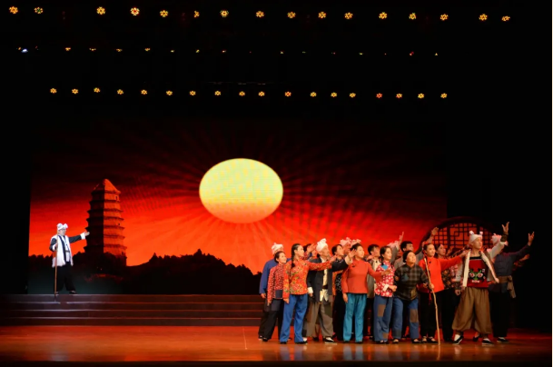 歌舞劇《南泥灣》以陜北青年腰鼓、窗花為男女主人公,通過(guò)安塞腰鼓、陜北說(shuō)書、陜北民歌等典型黃土風(fēng)情文化元素,展示陜北元素,講述紅色故事,全方位、多角度地展現(xiàn)了上世紀(jì)4 0 年代初發(fā)生在南泥灣轟轟烈烈的大生產(chǎn)運(yùn)動(dòng)以及在大生產(chǎn)運(yùn)動(dòng)中產(chǎn)生的“自力更生、艱苦奮斗”的南泥灣精神,傳頌勞模精神、禮贊工匠精神、弘揚(yáng)延安精神。