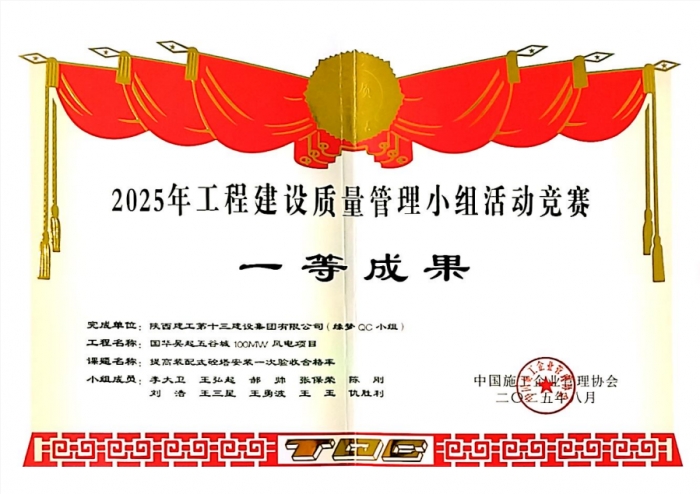近日,中國施工企業(yè)管理協(xié)會(huì)公布了“2025年工程建設(shè)質(zhì)量管理小組成果大賽”獲獎(jiǎng)名單,集團(tuán)國華吳起五谷城100MW風(fēng)電項(xiàng)目“緣夢QC小組”參賽成果《提高裝配式砼塔安裝一次驗(yàn)收合格率》獲得大賽一等獎(jiǎng)。